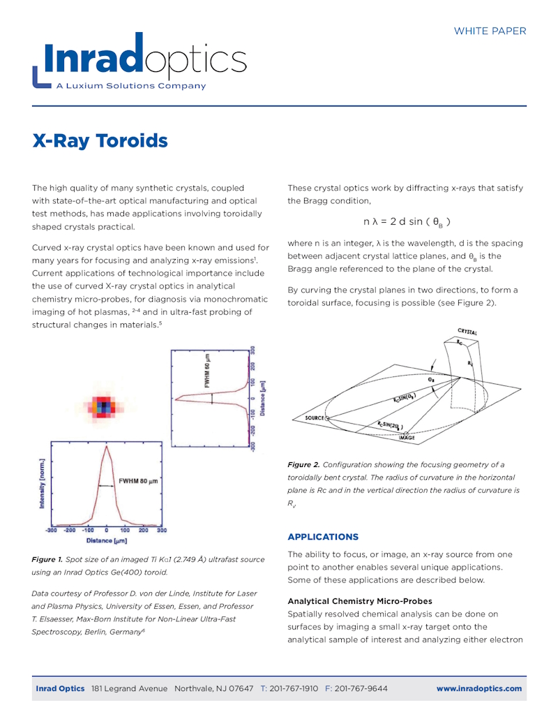 Using toroidally shaped crystals is more practical now than ever, thanks to the high quality of synthetic crystals and state-of-the-art optical manufacturing and testing methods. For years, curved x-ray crystal optics have been used to analyze x-ray emissions in applications like analytical chemistry micro-probes and plasma diagnostics.