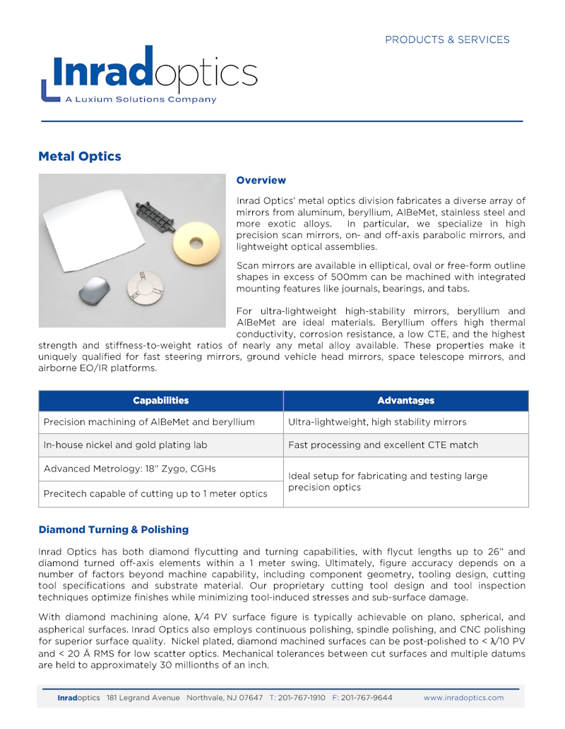 Inrad Optics' metal optics division fabricates a diverse array of mirrors from aluminum, beryllium, AlBeMet, stainless steel and more exotic alloys. In particular, we specialize in high precision scan mirrors, on- and off-axis parabolic mirrors, and lightweight optical assemblies.