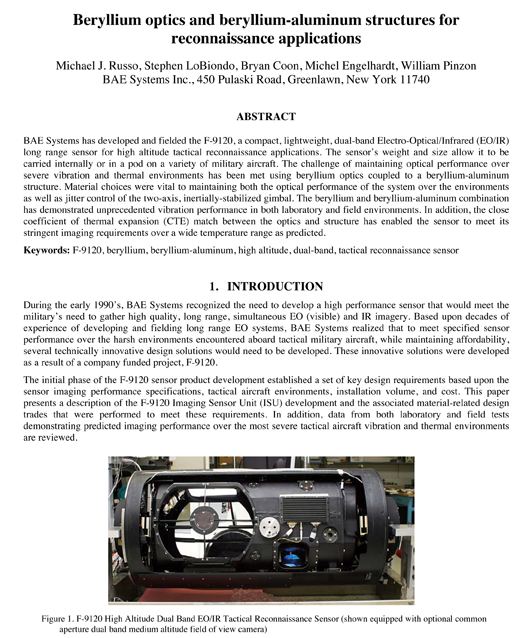BAE Systems has developed and fielded the F-9120, a compact, lightweight, dual-band Electro-Optical/Infrared (EO/IR) long range sensor for high altitude tactical reconnaissance applications. The sensor’s weight and size allow it to be carried internally or in a pod on a variety of military aircraft. The challenge of maintaining optical performance over severe vibration and thermal environments has been met using beryllium optics coupled to a beryllium-aluminum structure. Material choices were vital to maintaining both the optical performance of the system over the environments as well as jitter control of the two-axis, inertially-stabilized gimbal. The beryllium and beryllium-aluminum combination has demonstrated unprecedented vibration performance in both laboratory and field environments. In addition, the close coefficient of thermal expansion (CTE) match between the optics and structure has enabled the sensor to meet its stringent imaging requirements over a wide temperature range as predicted.